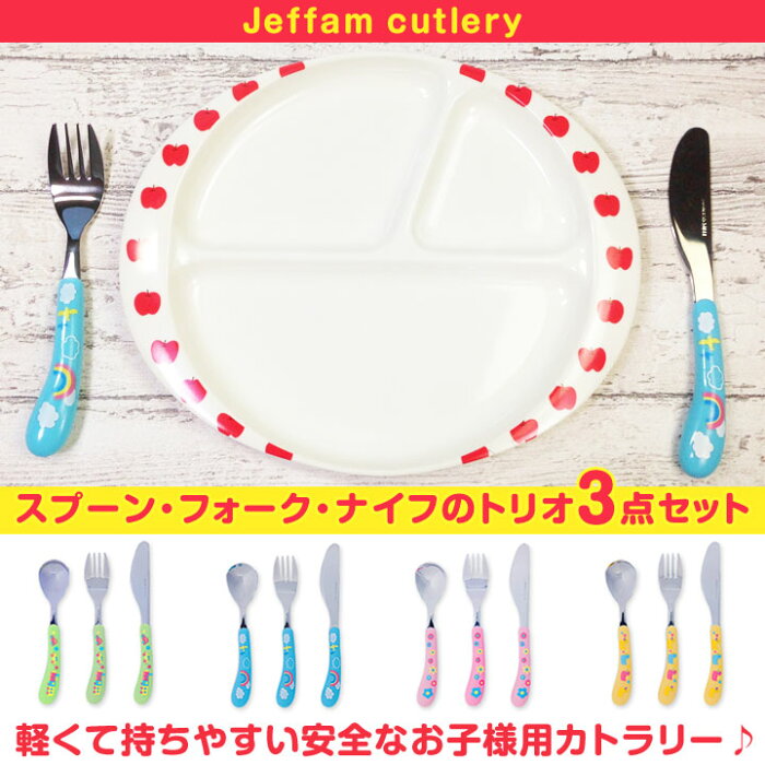 【メール便対応】ジェファムカトラリー ・安全でおしゃれかわいいベビーカトラリー♪スプーン・フォーク・ナイフのトリオセットで子供キッズのお弁当、幼稚園や保育園の給食に大活躍の食器シリーズ♪先が丸くなっているのでベビー食器にも最適。ギフト出産祝いにも!