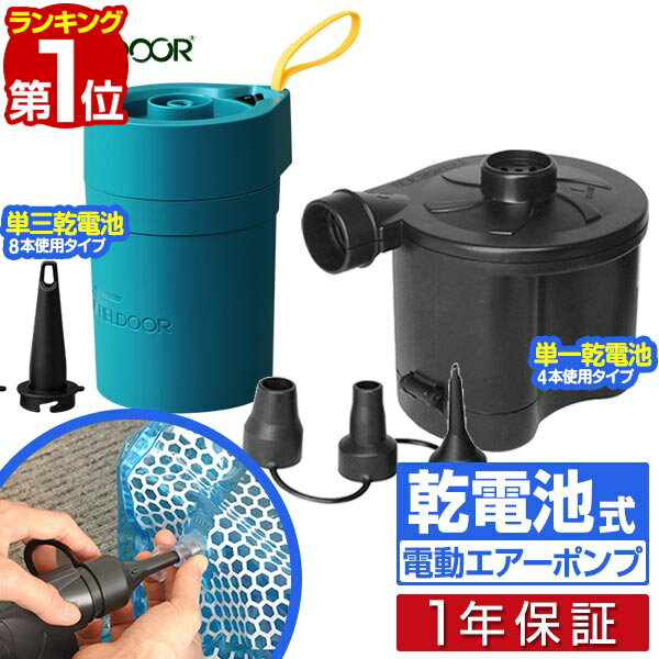 乾電池の種類/性能で選べる2タイプ ●ブラック(単一乾電池×4本使用) 電池長持ち、ポンプを頻繁に使用する場合にオススメ ●ブルー(単三乾電池×8本使用) 熱くなりにくく使いやすいので安心商品詳細 ブランド: フィールドア(FIELDOOR) タイプ: ・ブラック(単一乾電池式) ・ブルー(単三乾電池式) サイズ: ブラック:(約)幅12cm×高さ11.5cm ブルー:(約)幅9.5cm×奥行8.5cm×高さ12cm アダプターサイズ: ブラック:(約)小 : 7-8mm / 中 : 17-18mm / 大 : 22-23mm ブルー:(約)小 : 7-9mm / 中 : 17-17.5mm / 大 : 25.5mm 使用電池: ブラック:単一乾電池×4本使用(別売) ブルー:単三乾電池×8本使用(別売) 重量: ブラック:(約)300g※電池含まず ブルー:(約)280g※電池含まず 材質(共通): ABS樹脂 吹出量: ブラック:(約)260L/分 ブルー:(約)400L/分 付属品(共通): 専用ノズル、取扱説明書 特記事項: ※商品に電池は付属しておりません。