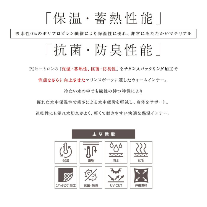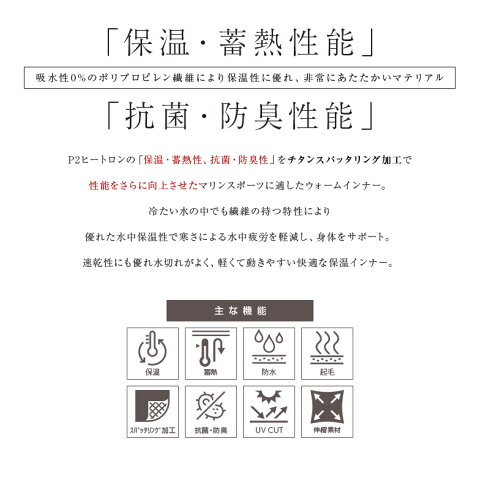 ポリプロピレン素材で水分を吸収せず*保温性に優れ、非常にあたたかいマテリアル P2ヒートロンの「保温・蓄熱性、抗菌・防臭性」をチタンスパッタリング加工で性能をさらに向上させたマリンスポーツに適したウォームインナーです。
