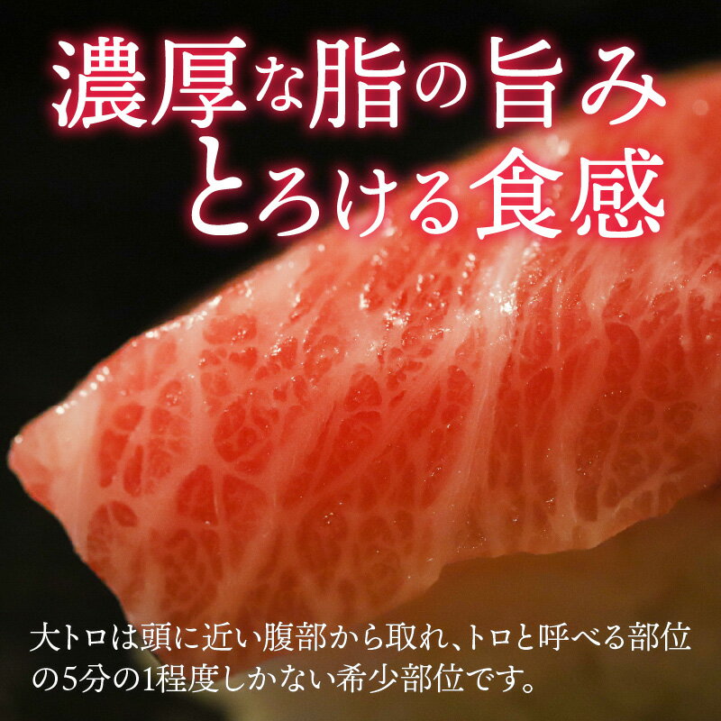 ポイント1:希少価値の高い本マグロの大トロ 大トロは頭に近い腹部から取れ、トロと呼べる部位の5分の1程度しかない希少部位です。