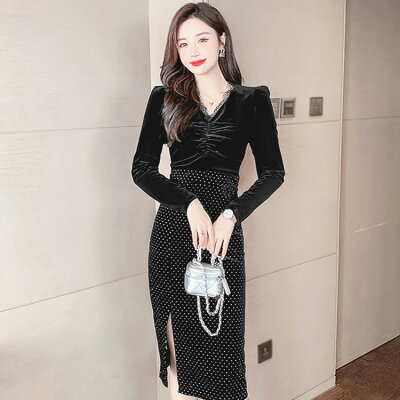 パーティードレス ベロアワンピース ミディアム丈 膝丈 長袖 黒 きれいめ タイト 細見え 大きいサイズ 成人式 クリスマス バレンタイン 結婚式 謝恩会 二次会 発表会 お呼ばれ 忘年会 新年会 卒業パーティー 秋 冬