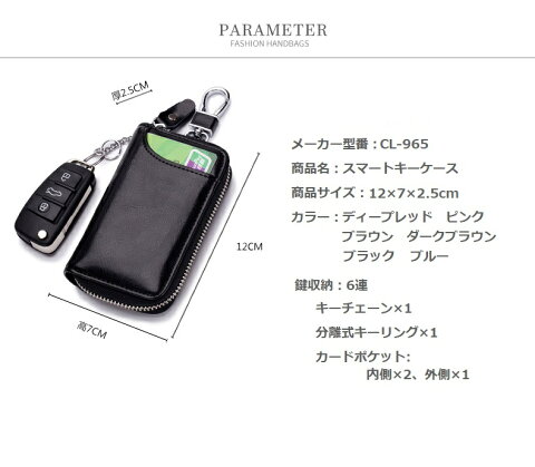 仕様 ・長さ:約12cm ・高さ:約2.5cm ・幅:約7cm ・材質:牛革 ・内寸:約11×6cm ・鍵収納:6連 ・カードポケット:内側×2、外側×1 ・キーチェーン×1 ・分離式キーリング×1 ・バリエーション:ディープレッド、ピンク、ブルー、ブラウン、ダークブラウン、ブラック ・メーカー型番:CL-965 注意事項 ※海外生産品の為、多少の傷、汚れなどがある場合がございますが、正規品として取り扱っております。